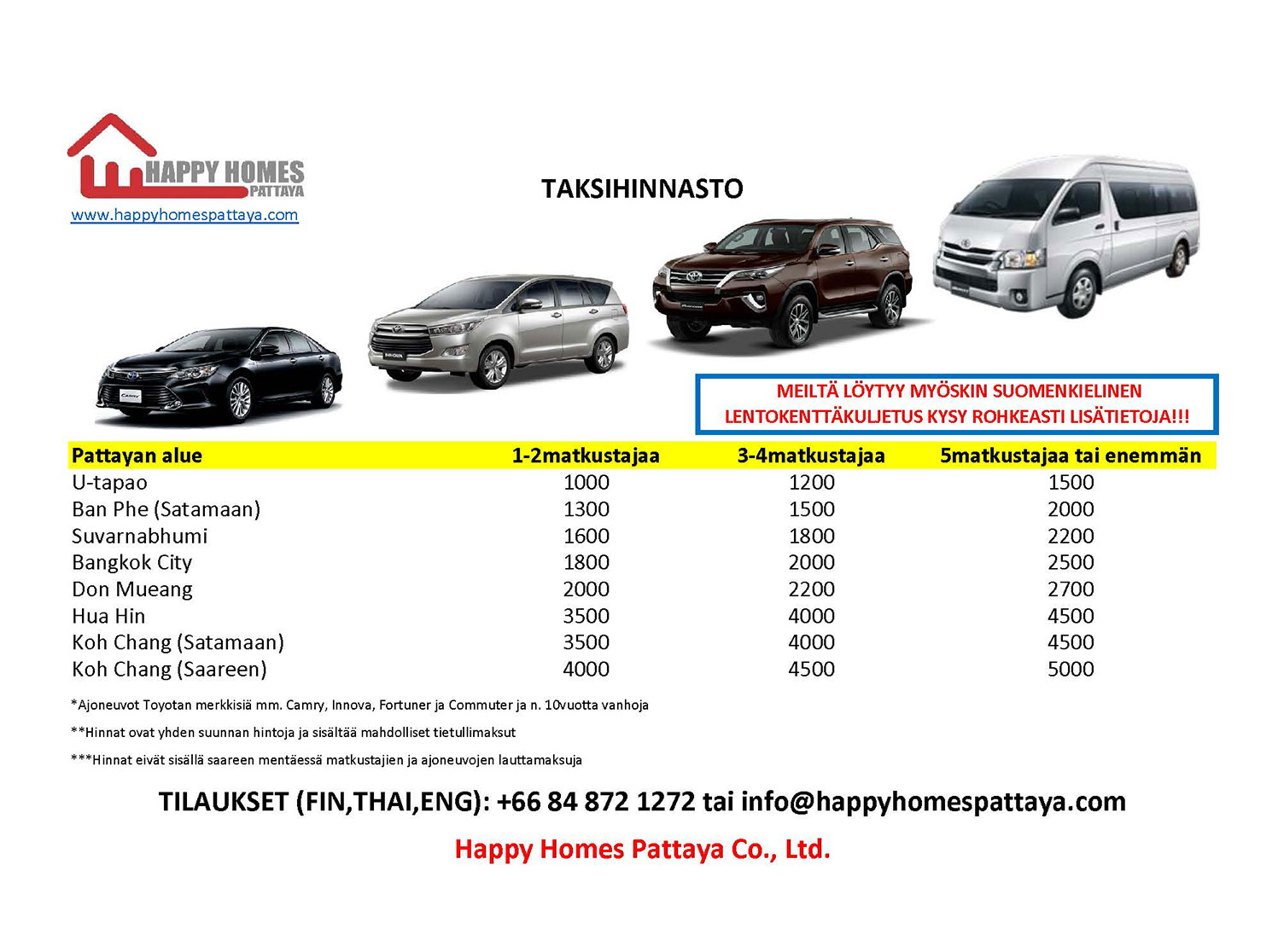 Happy Homesilta luonnollisesti kaikki kuljetukset. Esimerkiksi lentokenttäkuljetukset Pattaya-Suvarnabhumi alkaen 1.600 thb/1-2 hlöä.